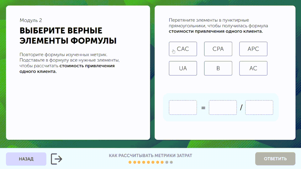 Тренажёры научат определять юнит бизнеса и работать со сложными формулами. Вы научитесь рассчитывать главные метрики бизнеса, которые показывают экономическое состояние продукта.
