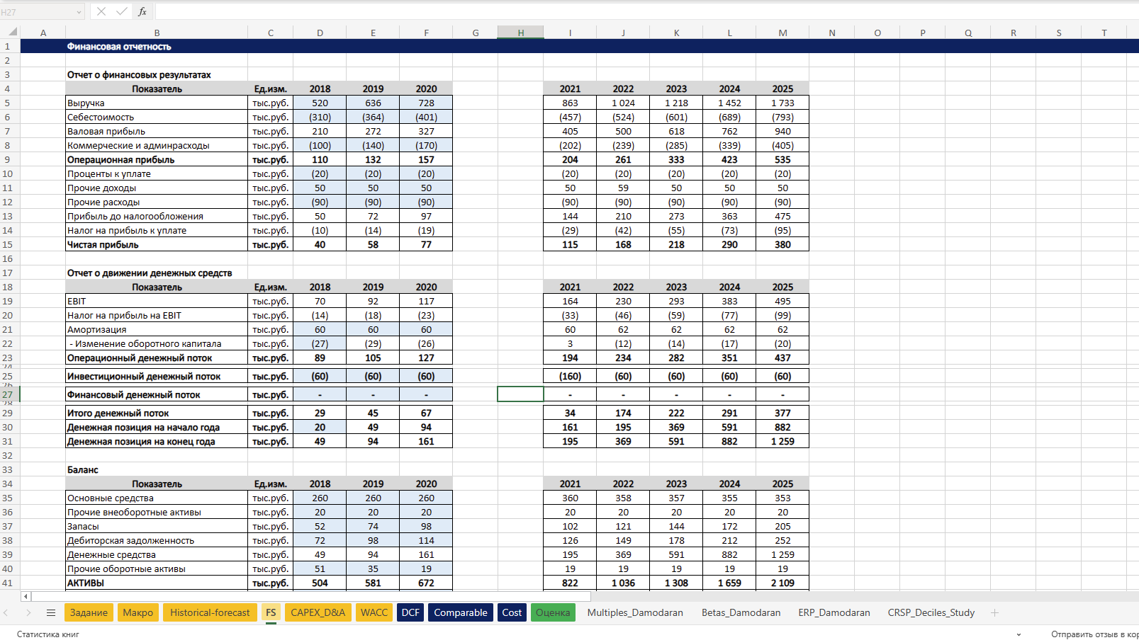Подготовите исходные данные, сделаете прогноз выручки и операционных расходов. Составите прогнозную финансовую отчетность. Проведете оценку компании методом DCF.