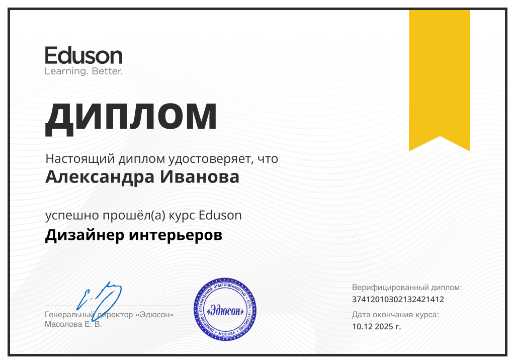 После прохождения уроков и выполнения практических кейсов вы получите официальный диплом Академии Eduson — резидента «Сколково»
