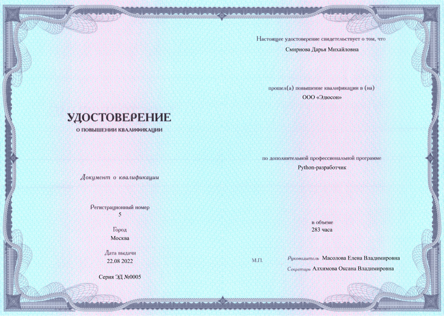 После окончания курса вы получите удостоверение о повышении квалификации установленного образца. Дополнительно вы получите официальный диплом о прохождении курса с уникальным номером, печатью Академии и подписью ее основателя.