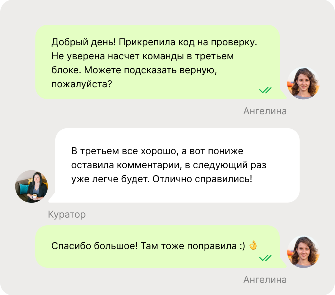 Конечно! На год у вас будет личный куратор во время и после обучения. Вы сможете задать вопросы касательно курсов и даже ваших текущих задач. С куратором можно общаться через удобный канал связи: почту или популярные мессенджеры.
