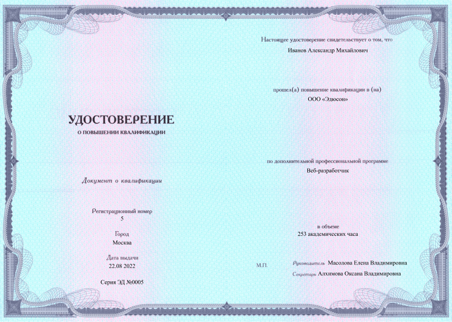 После окончания курса вы получите удостоверение о повышении квалификации установленного образца. Дополнительно вы получите официальный диплом о прохождении курса с уникальным номером, печатью Академии и подписью ее основателя.